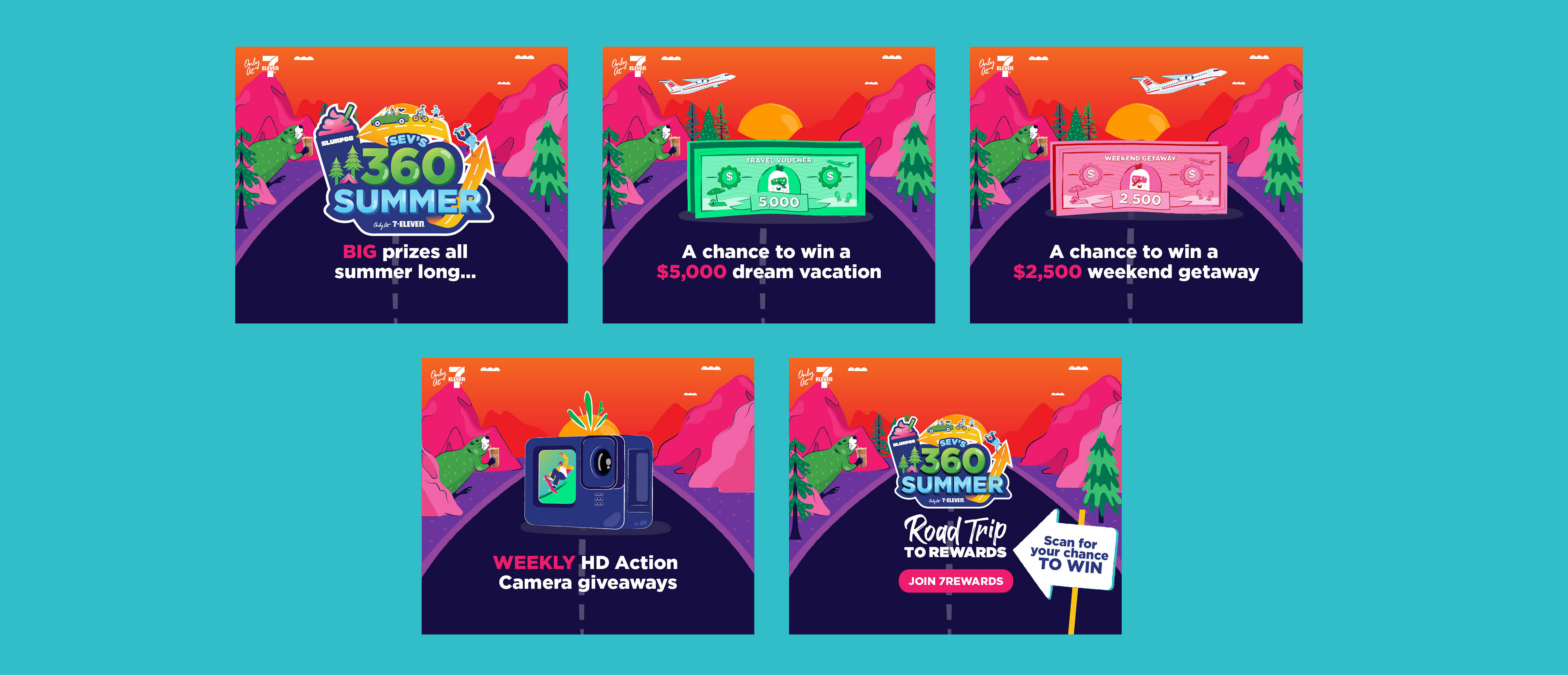 Art direction and illustrations for 7-Eleven's 2022 360 Summer campaign. Running from the months of May to September, this contest asked 7-Eleven customers, 7Rewards members, Slurpee fans and sun lovers to scan their purchases in the app and take off on an epic Canadian summer road trip adventure with 7-Eleven. The integrated campaign spans digital, in-store and broadcast, inviting 7-Eleven customers to enter the Road Trip to Rewards contest for a chance to win amazing prizes all summer long such as $5000 travel vouchers, HD action cameras and free 7Rewards points that can be redeemed for tasty summer treats.