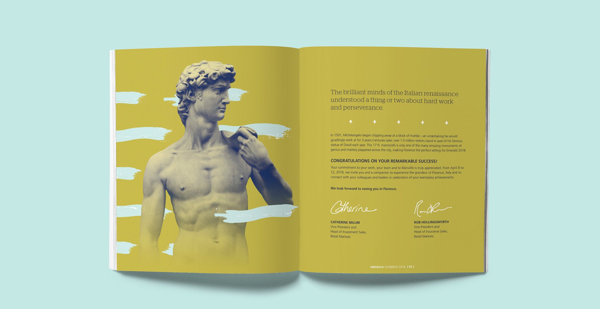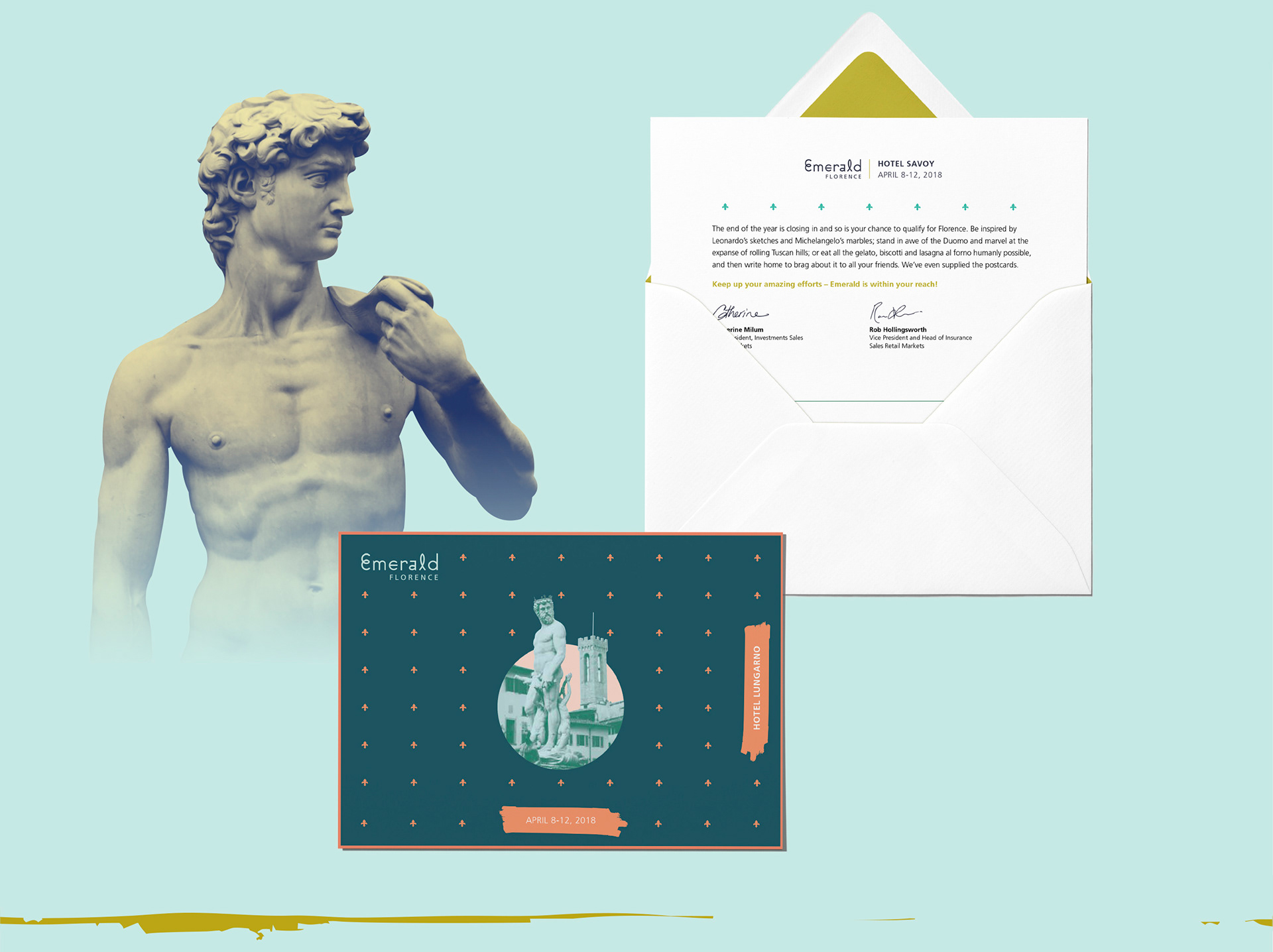 Visual identity for Emerald 2018, an annual event hosted by Manulife which was held in Florence, Italy. A series of collateral material (such as postcards, an invite, and a registration booklet) was developed in order to showcase the landscape and the art that makes of Florence an open sky museum. /// Identité visuelle pour Émeraude 2018, un évènement annuel organisé par Manuvie qui s’est déroulé à Florence en Italie. Une série de matériaux promotionnels (tels qu’une invitation, des cartes postales et un livret) furent produits afin de montrer les paysages de la ville ainsi que l’art qui fait de Florence un musée à ciel ouvert.